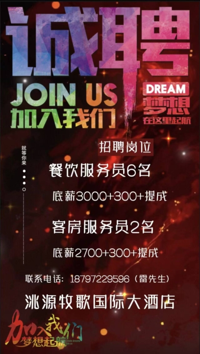 河南县洮源牧歌国际大酒店诚聘各类人才我们期待您的加入,共同打造一流的酒...